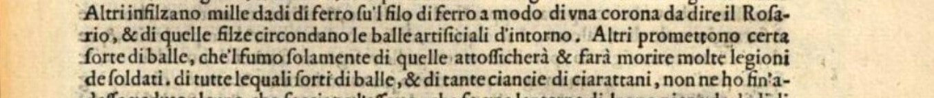 [...] che à questo proposito, dirò quel che mi occorse à ragionare, con il Serenissimo Signor Duca di Mantoua l'Anno 1592. essendo io dimandato, da quella Altezza ritrouandosi lei à Casale di Monferrato, doue facendomi veder la sua artigliaria , trouai essetui vna buona quantità di Cannoni si grossi, & disproportionati, & di vna sì smisurata bocca che veramente di ogn'vn di loro, se ne poteuano formar duoi belli Cannoni di batteria; de lire cinquantacinque di palla, che ripresentandolo à Sua Altezza i danni,che apporta à vn Signore l'artiglieria si dismisuratamente grossa, a risolfe di disfarla; Il che non sò se hebbe effetto, perché non son mai là ritornato. perilche totno [sic, torno] à dire che simili [...] (Collado, 1606: 111-112).