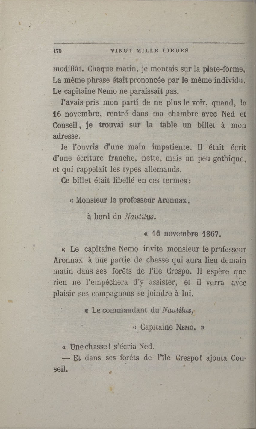 Nous quittâmes le salon. Dans la bibliothèque, personne. À l’escalier central, au poste de l’équipage, personne. Je supposai que le capitaine Nemo devait être posté dans la cage du timonnier. [...] (H71, 359)