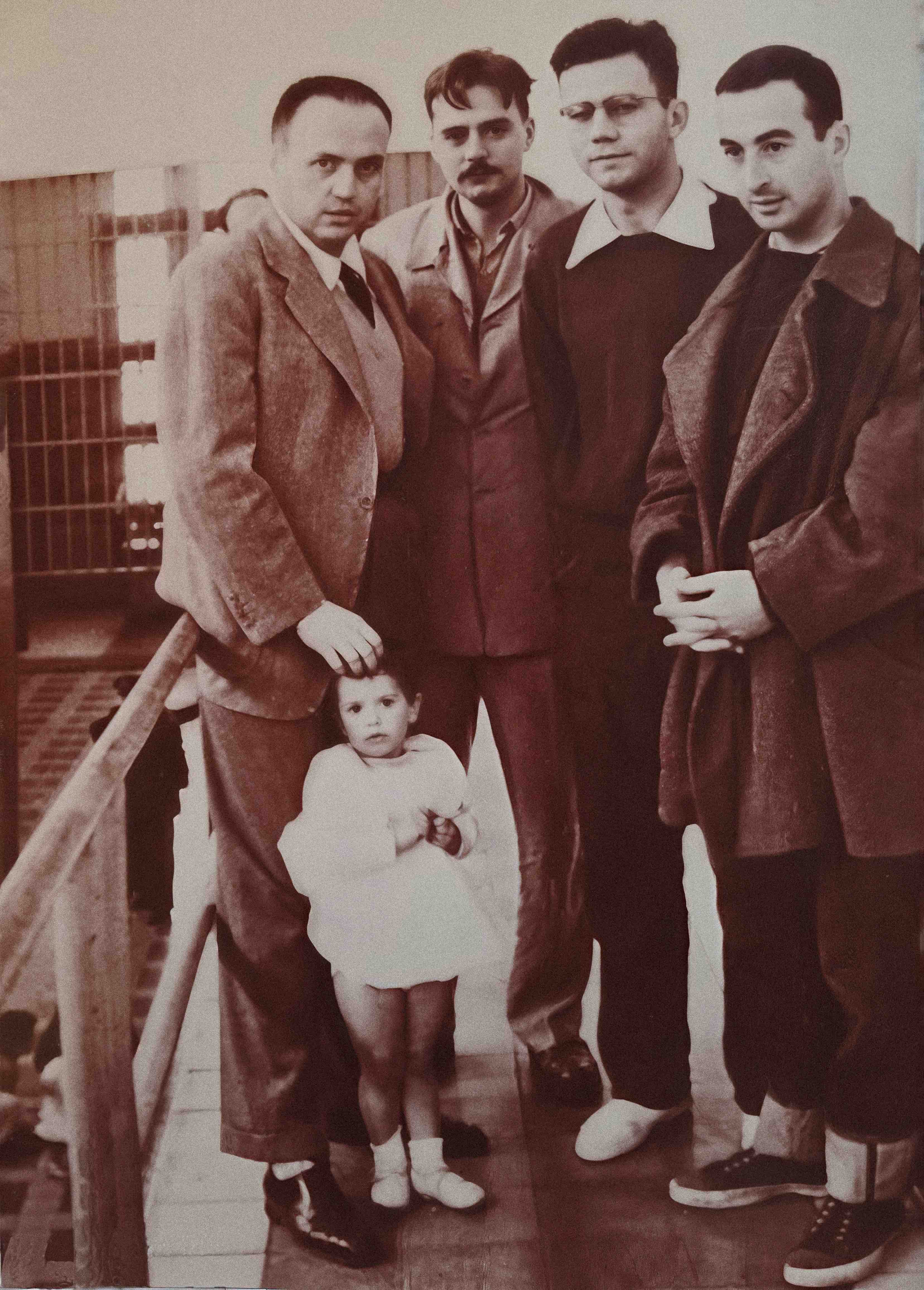 Vicente Girbau, Julián Marcos, Francisco Bustelo y Pablo Sánchez Bonmatí en la cárcel de Carabanchel (abril de 1956); la niña es una sobrina del también preso político Adolfo Lucas Reguilón García